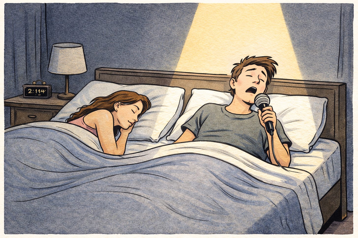 Então, se você dorme com alguém, pode se considerar um sonilóquio, pois vai ter uma plateia. Pequena, desatenta, mas não deixa de ser. Aliás, o pré-requisito para se descobrir que se fala dormindo é ter plateia e você estar querendo mostrar sua “arte” naquela noite — ou seja lá qual for a hora em que você dá seu show. Caso não tenha plateia, nunca vai saber se fala ou não. Você é como uma árvore caindo na floresta: caiu, mas ninguém ouve que caiu.