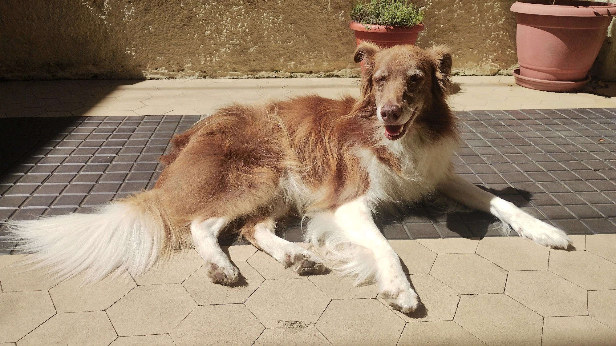 Banho de sol da Sarinha depois de ter o pêlo escovado.