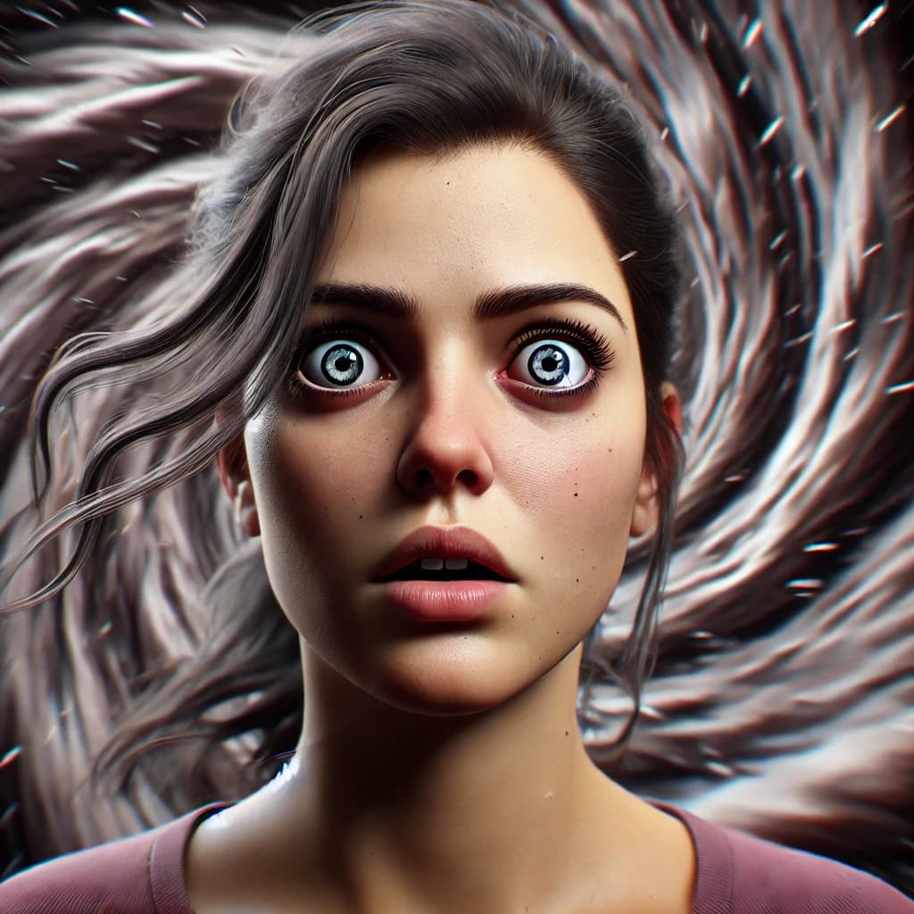 Olhos arregalados, boca entreaberta.