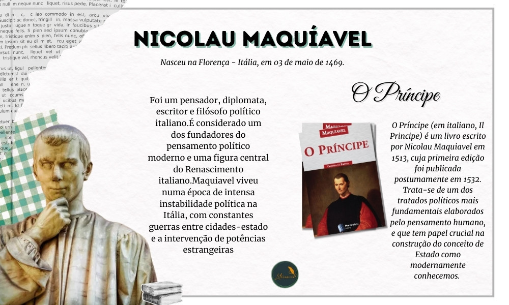 Nicolau Maquiavel (Niccolò Machiavelli) foi um pensador, diplomata, historiador e escritor italiano, nascido em Florença em 1469 e falecido em 1527. Ele é amplamente considerado um dos fundadores do pensamento político moderno, especialmente por seu olhar realista — e por vezes cínico — sobre o poder e a política.