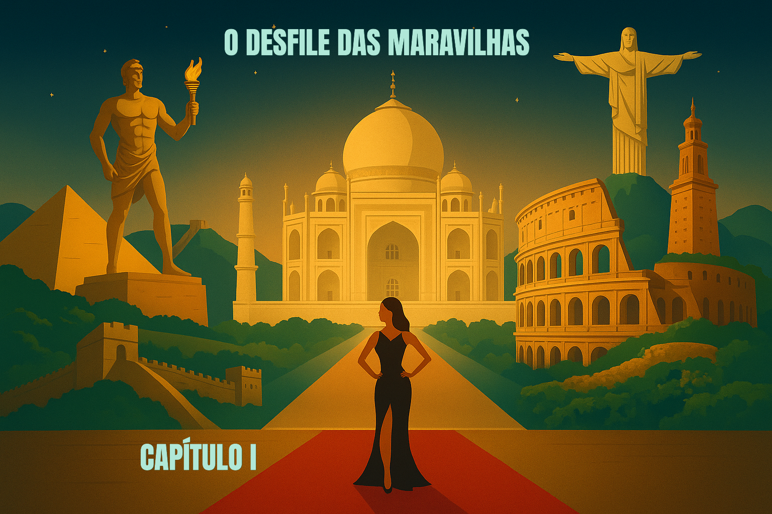 隣 Maravilha Moderna – Grande Muralha (China) Ela se estende por quilômetros, ondulando como serpente da Terra: — Por favor, piramidinha… aqui chega a mais ilustre e longa do planeta. A Pirâmide revira seus blocos e responde: — Extensão não define grandeza, querida. A Muralha rebate: — Melhor comprida que saqueada por milênios. Risos. A Pirâmide tosse de forma milenar, soltando um grão de areia: — Magoei. Os historiadores vibram. Os fotógrafos disparam flashes. E o evento prossegue. ________________________________________ Maravilha Antiga – Farol de Alexandria (Egito) Um hieróglifo plasmado de luz e bronze se materializa. Três andares que antes guiavam navios e sonhos. Sentinela da Biblioteca de Alexandria e guia dos mares. O personagem avança na passarela e diz: — Eu era o farol que iluminava destinos, o wi-fi marítimo antes de qualquer bússola. Ele faz movimentos circulares; seu ápice de espelho reflete a energia solar e ofusca os presentes, que se curvam diante do seu brilho. Os artistas aplaudem. ________________________________________ ✝️ Maravilha Moderna – Cristo Redentor (Brasil) Acordes de bossa nova trazem harmonia. Ele surge com trinta e oito metros de braços abertos, abraçando o mundo do alto do Corcovado. Construído em pedra-sabão, símbolo da fé e da paz. Sorri com serenidade e anuncia: — Meu amigo Farol… eu também guio. Mas guio corações. O Farol pisca sua luz antiga: — E quando um navio se perde? Você abre mais os braços? Cristo sorri com calma celestial: — Eu confio na fé do marinheiro. A plateia dá um “ohhhh!”. O Redentor deixa a passarela. As pessoas ficam em clima de oração. ________________________________________