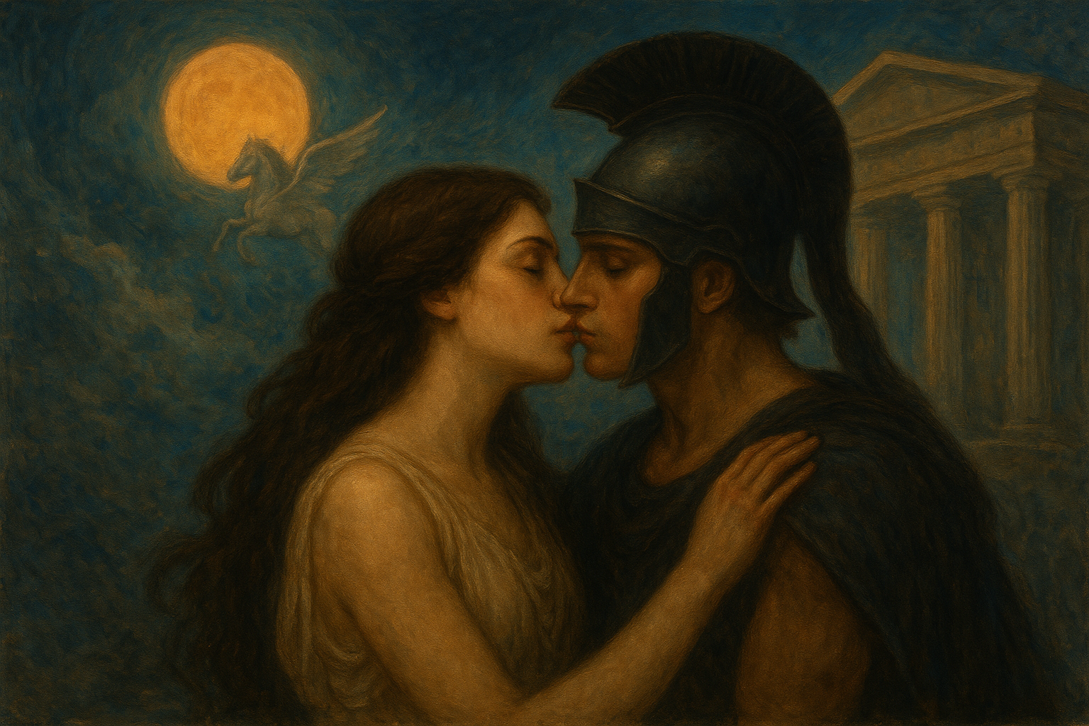A campainha toca. Ela atende à porta. Os olhos sem luz do visitante vislumbram além do véu de Ísis. O mito estende a mão para ela, que se deixa levar, presa no cumprimento. Caminham alguns passos até o terraço. Ela avista Pégaso e permite que sua liberdade voe. O poeta segura firmemente a rédea de ouro enquanto Helena, com o coração ardente, protege suas costas. Juntos, circulam Gaia, que pulsa no firmamento, e presenciam do alto Poseidon abençoando os mares e oceanos.